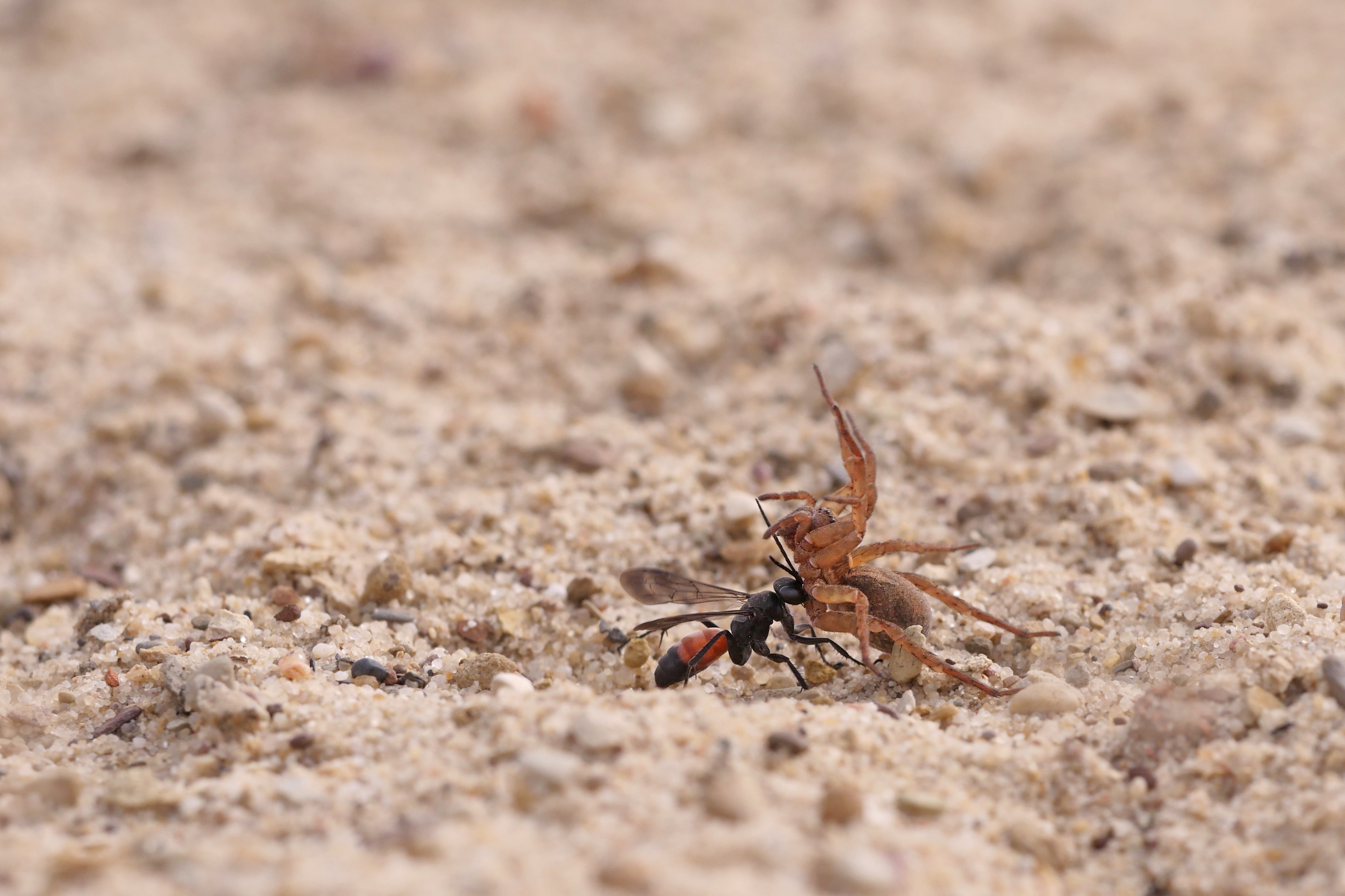 Eine Frühlingswegwespe mit einer erbeuteten Wolfsspinne