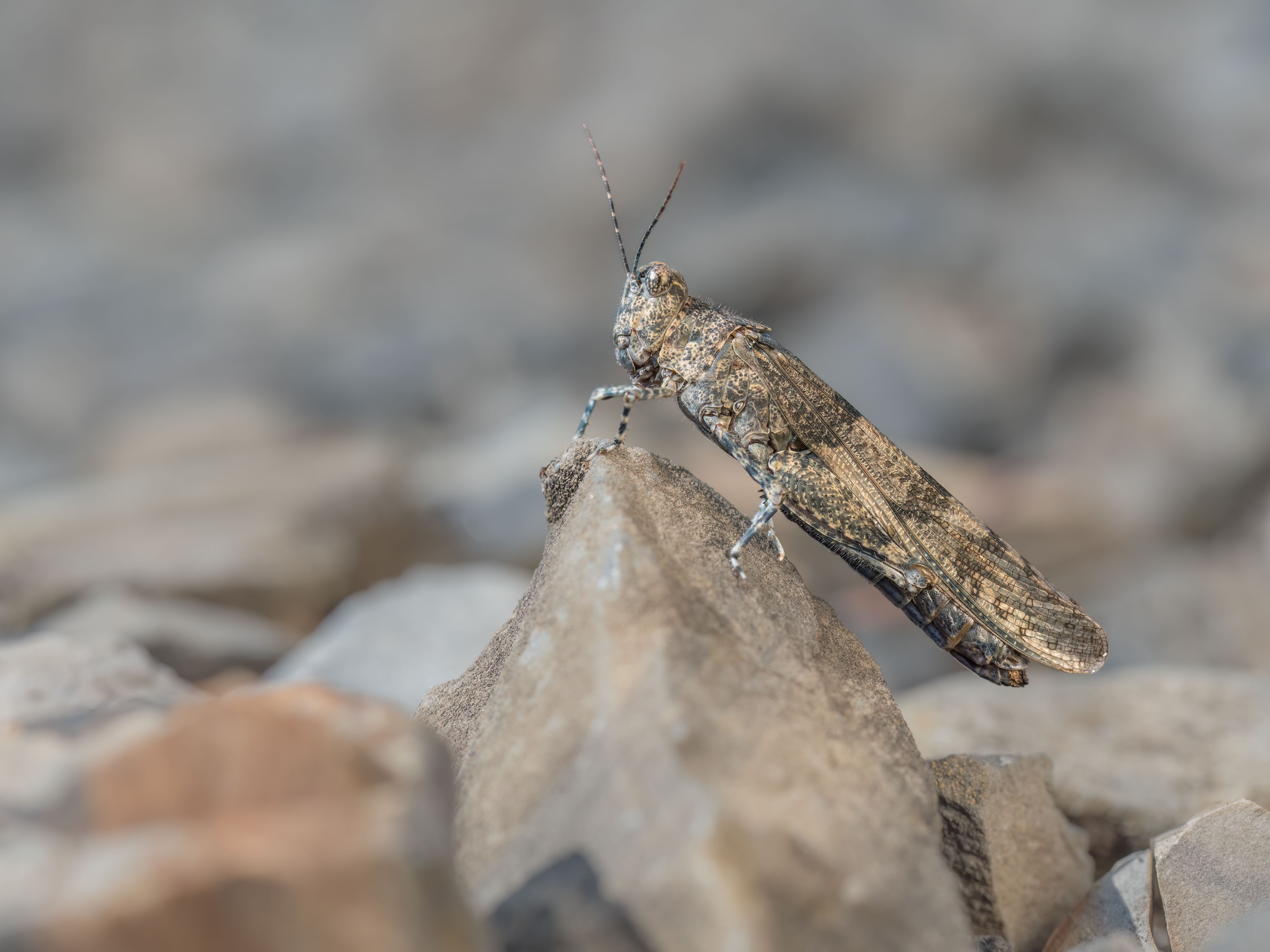 Gehen wir im Sommer über eine Industriebrache, sieht man sie erst, wenn sie weghüpfen – schließlich heißt „Schrecken“ ja im Althochdeutschen „Springen lassen“. Typisch für die steinigsandigen, warmen und vegetationsarmen Böden der Industrie-Folgelandschaft ist die optimal getarnte Blauflügelige Sandschrecke (Sphingonotus caerulans, Foto) sowie die Blauflügelige Ödlandschrecke (Oedipoda caerulescens). Letztere hat auf der Oberkante des Oberschenkels vom Hinterbein einen kleinen Versatz sowie einen Mittelkiel auf dem Rücken, welche der Sandschrecke fehlen. Beide Insektenarten sind aufgrund ihrer Eigenschaften und ihrem Vorkommen im Lebensraum Industriebrache geeignete Leitinsekten für die Ausstellung sowie die LWL-Museeen für Industriekultur.